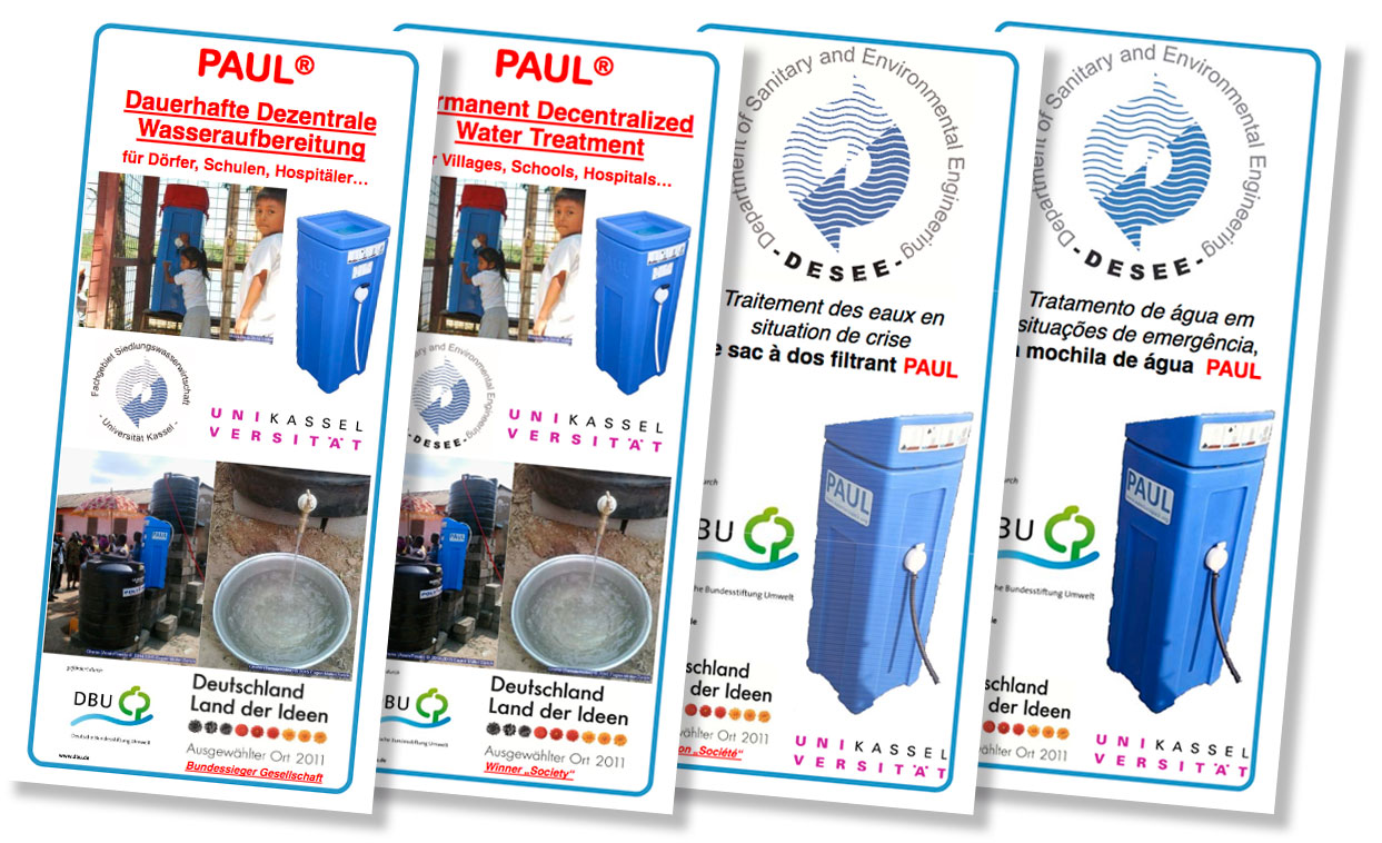 Eugen Müller machte sich auf die Suche nach simplen Trinkwassersystemen, die vor Ort einfach zu implementieren und zu warten sind. Fündig wurde er bei der Universität Kassel mit dem System Portable Aqua Unit for Lifesaving PAUL*. Für den Katastrophenfall in Deutschland wurden portable Wasserfiltertanks entwickelt, die aus noch so verschmutzten Wasser 99,9% der gesundheitsschädigenden Bakterien und Viren, sowie Grobteilchen zurückhalten und so sauberes Wasser herstellen.